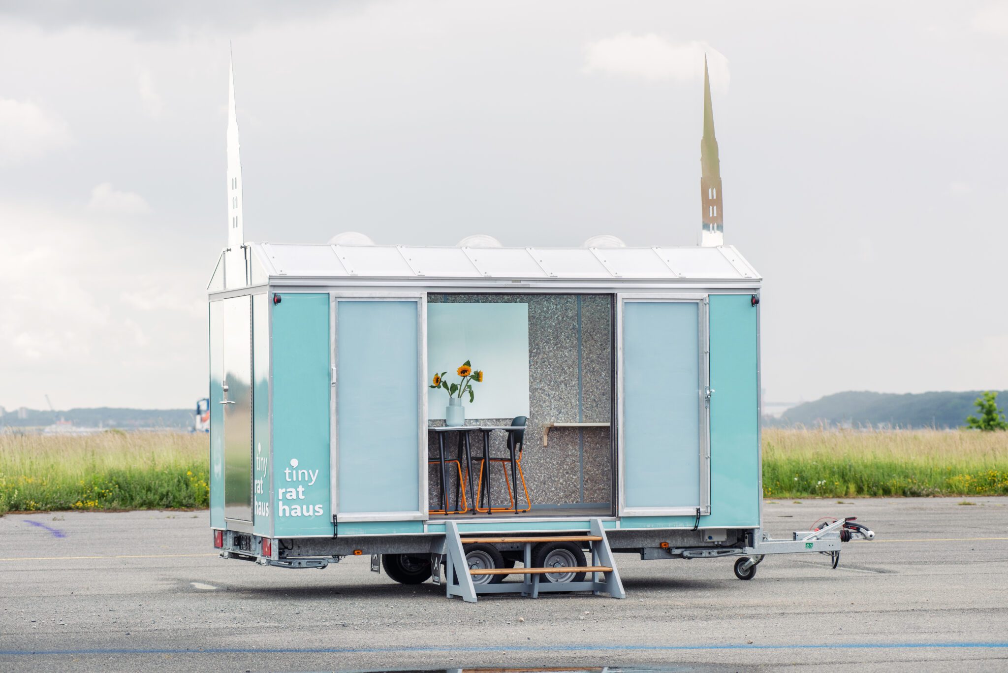 Das Tiny Rathaus ist ein mobiler Beteiligungsraum, der Bürger:innenbeteiligung direkt vor Ort ermöglicht. Als kompaktes, transportables Gebäude auf vier Rädern dient es als Plattform für Dialog, Mitgestaltung und Informationsaustausch, z.B. zwischen Verwaltung und Zivilgesellschaft. Mit einer Grundfläche von etwa 8,6 m² bietet das Tiny Rathaus Raum für Workshops, Sprechstunden und Beteiligungsformate.