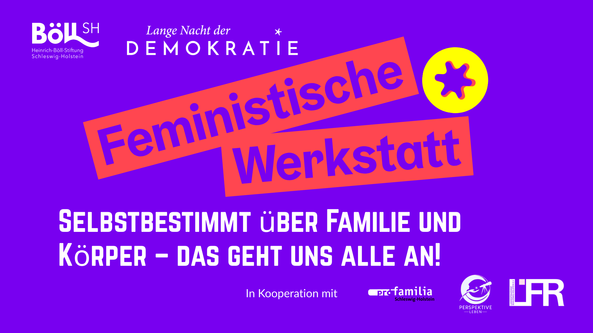 Die Feministische Werkstatt ist ein reisendes Format des Stiftungsverbunds der Heinrich Böll Stiftungen und des Gunda Werner Instituts. 2025/26 wird sie in verschiedenen Städten in Deutschland Station machen. Die Veranstaltung in Kiel findet in Kooperation mit dem Landesfrauenrat Schleswig-Holstein e.V., ProFamilia Schleswig-Holstein und Perspektive Leben e.V. statt.