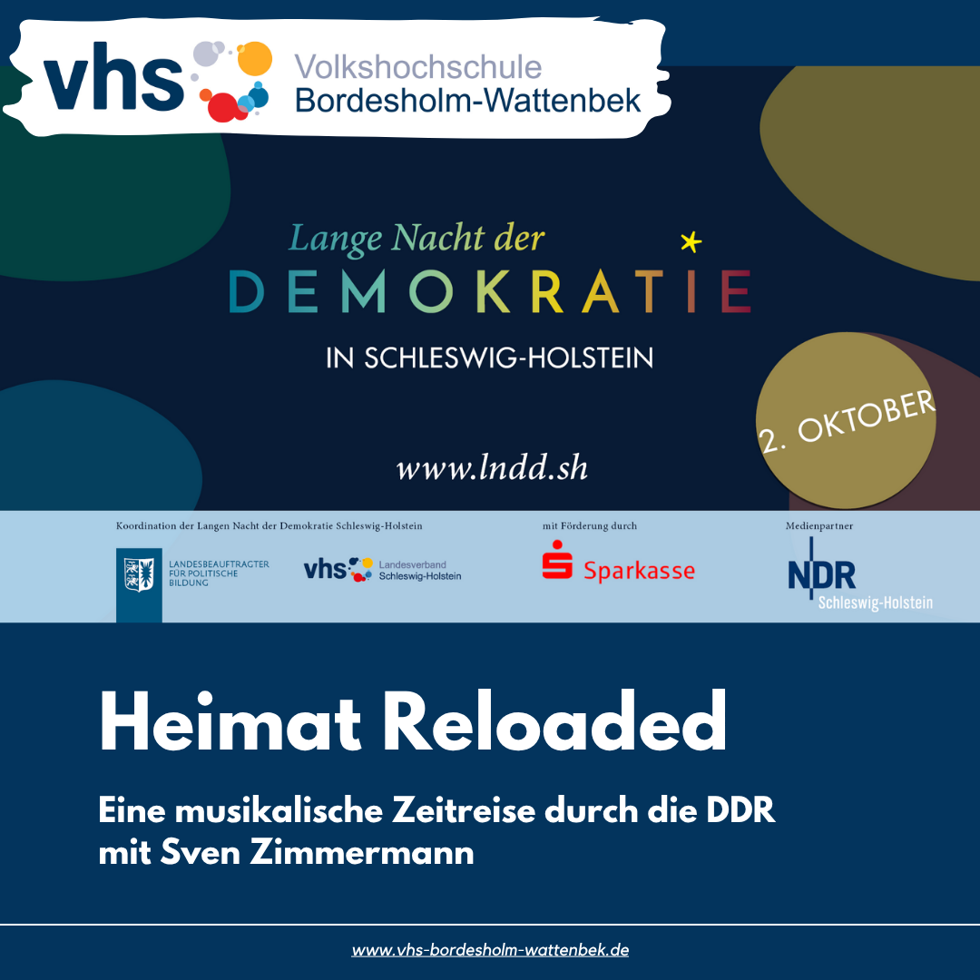 Eine musikalische Zeitreise durch die DDR. Der Musiker Sven Zimmermann erinnert sich mittels einer sehr persönlichen Auswahl von Kinder-, Pionier-, Jugend- und Rockliedern für sich und mit Ihnen an seine Heimat im Osten der Republik. Ein Programm mit persönlichen Texten und eigenen Interpretationen. Was sie schon immer über den Osten wissen wollten und sich nie zu fragen getraut haben. Auf Zuruf erinnert sich Sven Zimmermann ohne Netz und doppelten Boden und gibt Privates preis. Die Lange Nacht der Demokratie wird koordiniert vom Landesbeauftragten für Politische Bildung und dem Landesverband der Volkshochschulen S-H mit Förderung durch die Sparkassen und die Bordesholmer Sparkasse. Medienpartner ist der NDR. Die Veranstaltungen sind kostenfrei und können ohne Voranmeldung besucht werden. Dies ist eine Kooperationsveranstaltung der vhs Bordesholm-Wattenbek und dem Kinoverein Bordesholm e.V.