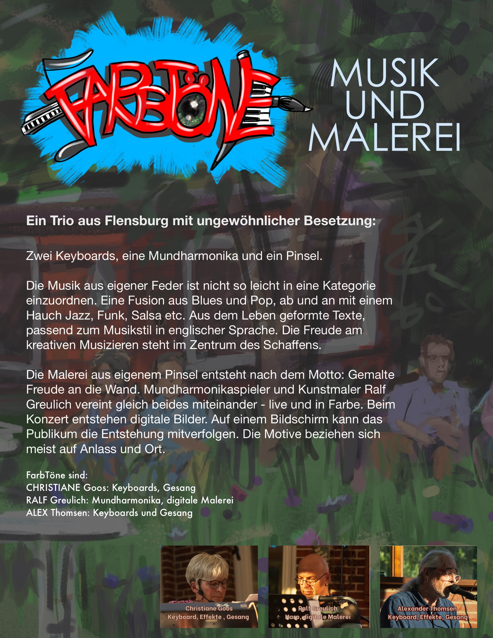 Zwei Keyboards, eine Mundharmonika und ein Pinsel. Eine Fusion aus Blues und Pop, ab und an mit einem Hauch Jazz, Funk, Salsa etc. Aus dem Leben geformte Texte, passend zum Musikstil in englischer Sprache. Beim Konzert entstehen digitale Bilder, die Mundharmonikaspieler und Kunstmaler Ralf Greulich mit gemalter Freude kreiert. Farbtöne sind: Christiane Goos, Ralf Greulich, Alex Thomsen Uhrzeit: 20.30 Uhr Ort: Aula des Museums, Museumsberg 1, 24937 Flensburg Gebühr: keine Kosten Anmeldung: ist nicht erforderlich Anfahrt: Buslinie 3, Haltestelle Katholische Kirche