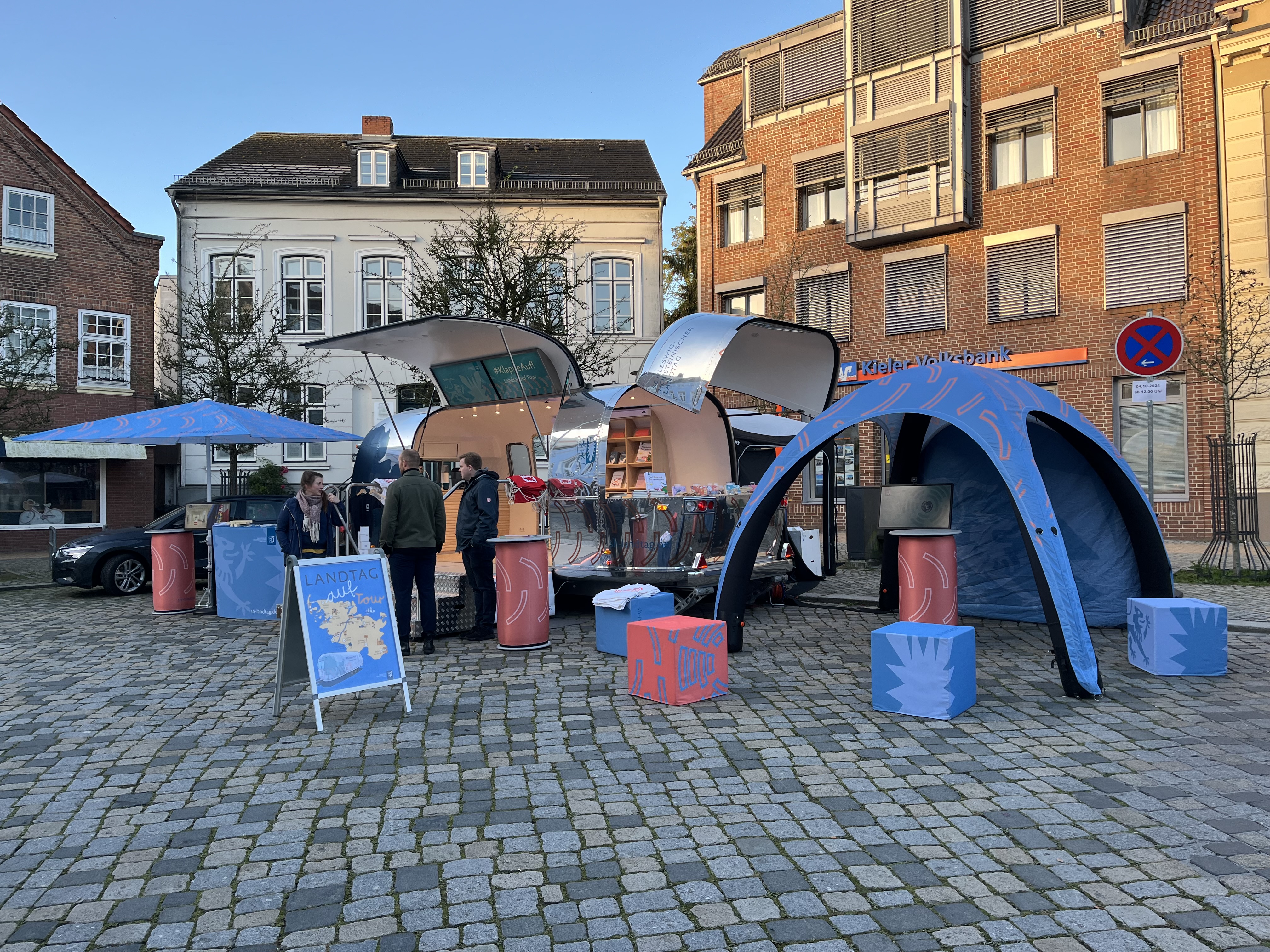 Wir beginnen die Lange Nacht der Demokratie am frühen Morgen mit dem Landtagsmobil des Schleswig-Holsteinischen Landtages, das jährlich durch das gesamte Bundesland tourt und überparteilich über die parlamentarische Arbeit des Landtages informiert sowie über die damit verbundenen Prozesse der Demokratie. Bürgerinnen und Bürger können am Landtagsmobil spannende Fragen über das Parlament oder Fragen mit Bezug auf den Einbürgerungstest in einem Quiz beantworten und mit Abgeordneten des Landtages ins Gespräch kommen.
