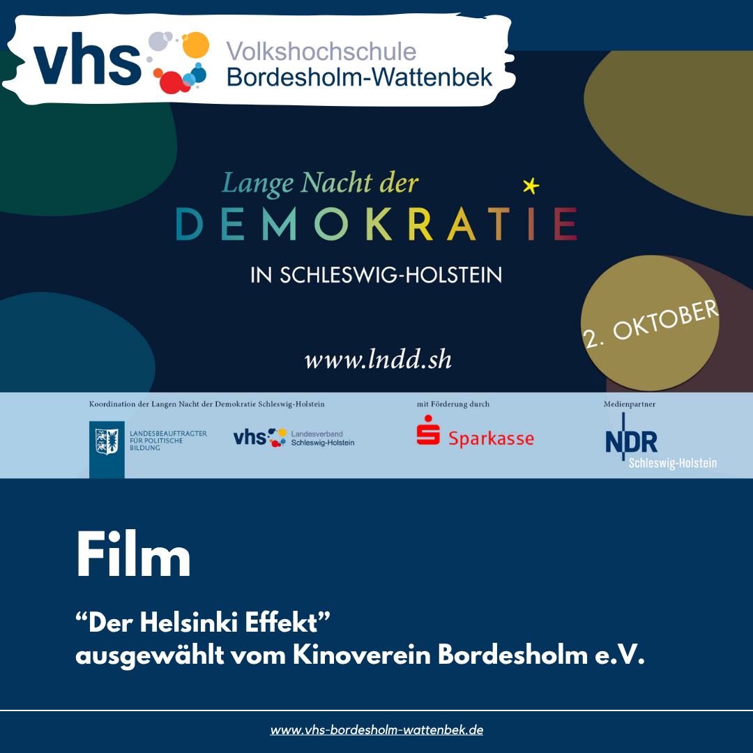 Filmbeitrag des Kinovereins Bordesholm e.V. zur Langen Nacht der Demokratie Regisseur Arthur Francks beleuchtet die historischen KSZE-Verhandlungen von 1975 in Helsinki und lässt die politischen Akteure jener Zeit auf ungewöhnliche Weise wiederauferstehen. Ausschließlich mit Archivmaterial und satirisch, KI-generierten Vertonungen geheimer Dokumente erzählt der Film von den zähen Verhandlungen zwischen Ost und West: Während die Sowjetunion auf die Anerkennung der Ostblock-Grenzen drängte, kämpften Westeuropa und die USA für Demokratie und Menschenrechte. Am Ende einigten sich 35 Staatschefs auf einen historischen Kompromiss – ein Abkommen, das nicht nur den Grundstein für das Ende des Eisernen Vorhangs legte, sondern auch den Zerfall der Sowjetunion und den Fall der Berliner Mauer einleitet. Die Lange Nacht der Demokratie wird koordiniert vom Landesbeauftragten für Politische Bildung und dem Landesverband der Volkshochschulen S-H mit Förderung durch die Sparkassen und die Bordesholmer Sparkasse. Medienpartner ist der NDR. Die Veranstaltungen sind kostenfrei und können ohne Voranmeldung besucht werden. Dies ist eine Kooperationsveranstaltung der vhs Bordesholm-Wattenbek und dem Kinoverein Bordesholm e.V..