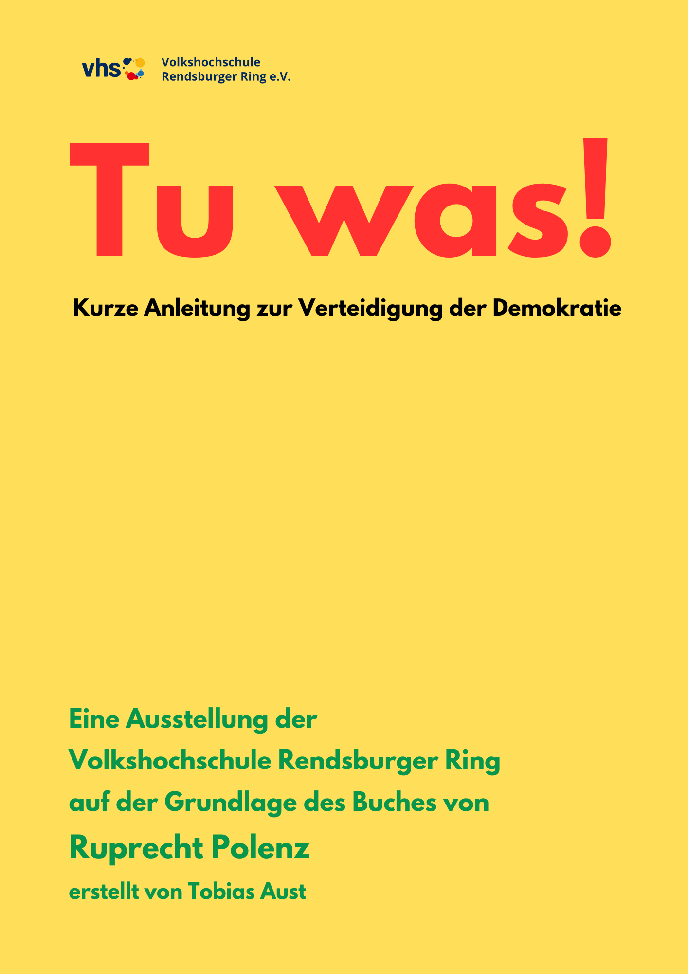Kurze Anleitung zur Verteidigung der Demokratie. Wir schauen uns die Ausstellung "Tu was!" der VHS Rendsburg an und erarbeiten in einer Werkstatt mit kokreativen Methoden, was jeder Einzelne jeden Tag für die Demokratie tun kann. Ganz praktisch, jeden Tag.